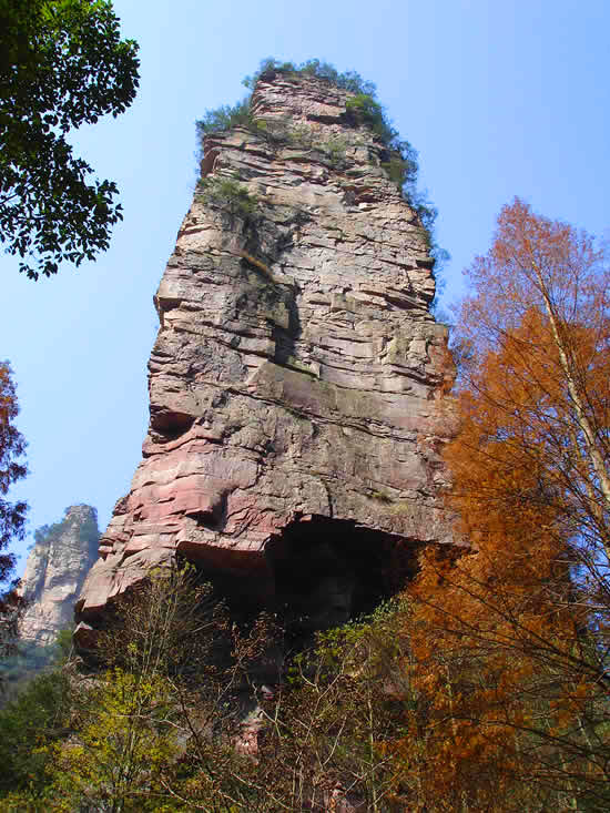 金鞭巖:過(guò)“閨門峰”沿溪而下約500米,有一座高約400米,孤標(biāo)直立,雄奇挺拔的奇峰,名金鞭巖。金鞭巖是武陵源著名景點(diǎn),峰體上細(xì)下粗,四棱分明。棱面布滿節(jié)理橫紋,形成鞭節(jié),渾如一根豎插大地的長(zhǎng)鞭。每當(dāng)夕陽(yáng)晚照,鞭身涂金,熠熠閃光,瑰麗奪目,構(gòu)成一幅奇特壯美的“夕陽(yáng)金鞭圖”。