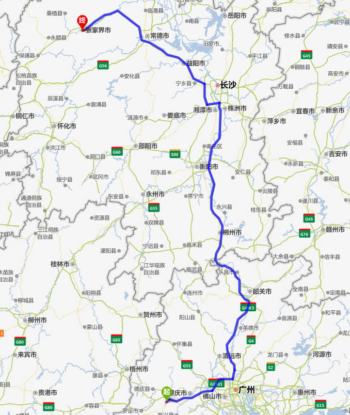 左右,沿途經過云浮——肇慶——清遠——英德市——韶關市——樂昌市——宜章縣——郴州市——耒陽市——衡陽市——湘潭市——寧鄉(xiāng)縣——益陽市——常德市——慈利縣——張家界。