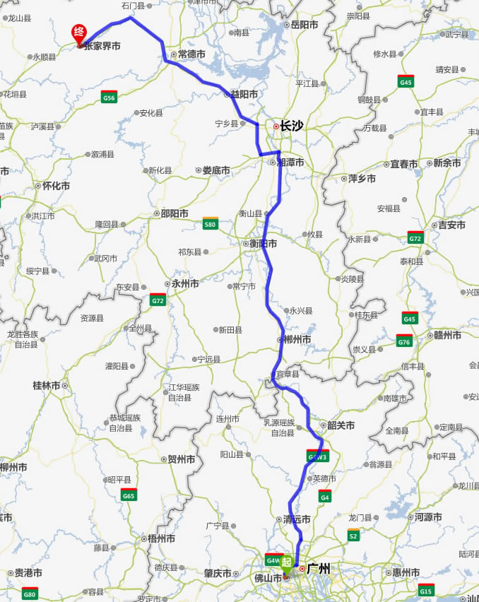 佛山去張家界自駕車自助游線路圖全程高速):