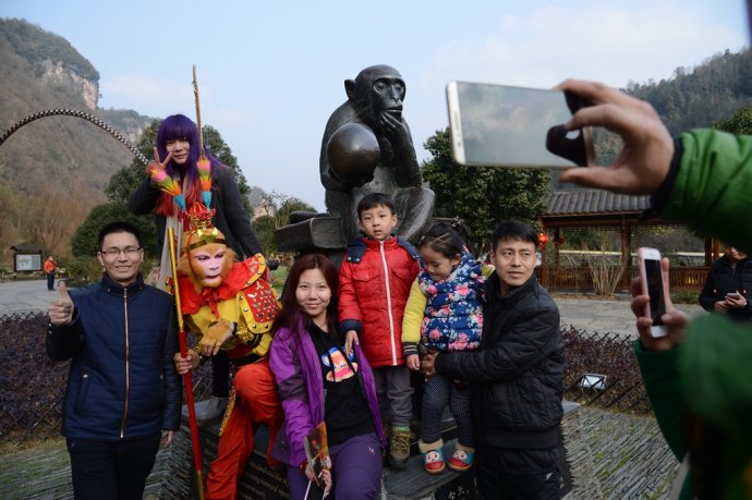 手持金箍棒,頭戴紫金冠。2月2日,農歷臘月二十四,中國傳統(tǒng)小年節(jié)氣。當天下午,旅游勝地張家界武陵源黃龍洞景區(qū),一名“美猴王”打扮的特殊游客現(xiàn)身“后天”雕塑、龍宮大廳、花果山等景點,其惟妙惟肖的“孫悟空”動作表演,不時引來其他游客的驚呼:大圣歸來!