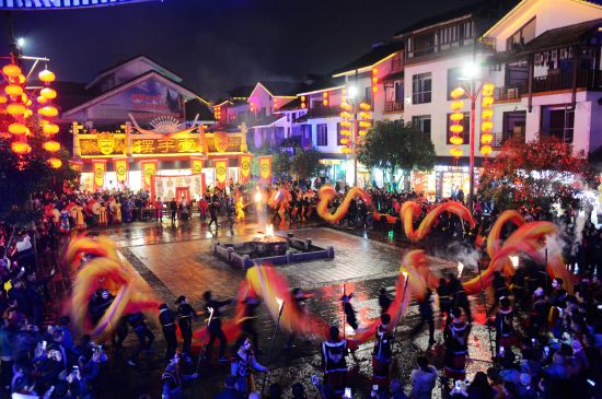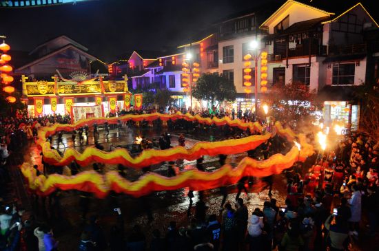 火龍出場(chǎng),街區(qū)狂舞;盤龍點(diǎn)睛,眾人祈福。12月21日,農(nóng)歷冬至,當(dāng)天夜晚在旅游勝地張家界武陵源區(qū)溪布老街?jǐn)[手堂廣場(chǎng)啟動(dòng)的 “武陵腔調(diào):趕火趕戲趕大年”活動(dòng)儀式上,一條全身似火的長龍?jiān)诮倜良覂号奈鑴?dòng)下 “閃亮”登場(chǎng),格外耀眼。據(jù)了解,這條長龍身有香味,全長108米,是目前世界最長的香火龍。